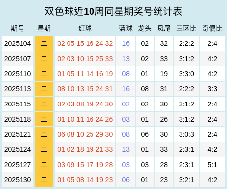 双色球近十周同星期奖号统计表